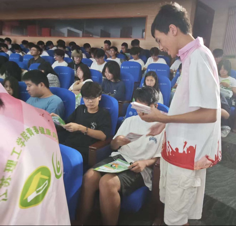 讲座现场,江苏理工学院青春健康同伴社的志愿者们积极行动,为大家发放精心准备的疾病防控的宣传册。