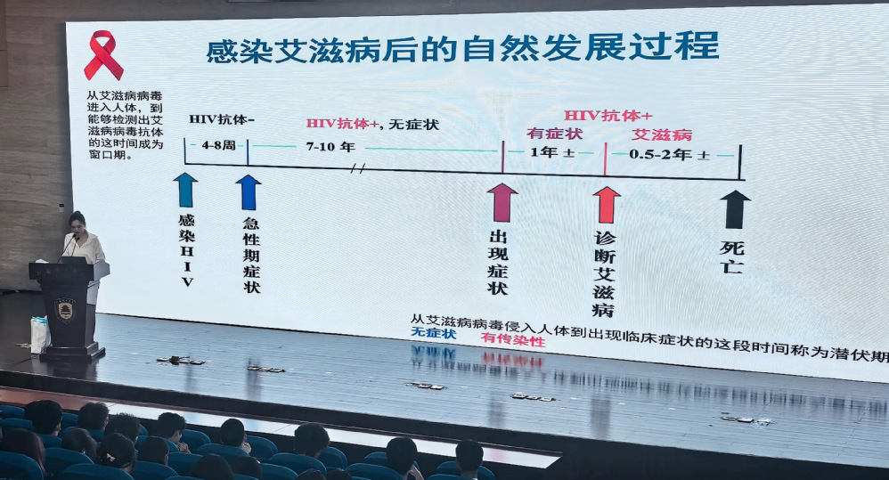 疾病防控讲座的前半场主要聚焦艾滋病防治,专家结合真实案例与详实数据,深入浅出地讲解了艾滋病的传播途径、有效预防措施等关键信息,专家特别提醒同学们留意日常生活中的健康细节,比如不与他人共用牙刷、剃须刀等可能接触血液的物品。同时专家也指出,同学们不能对艾滋病患者抱以歧视态度。